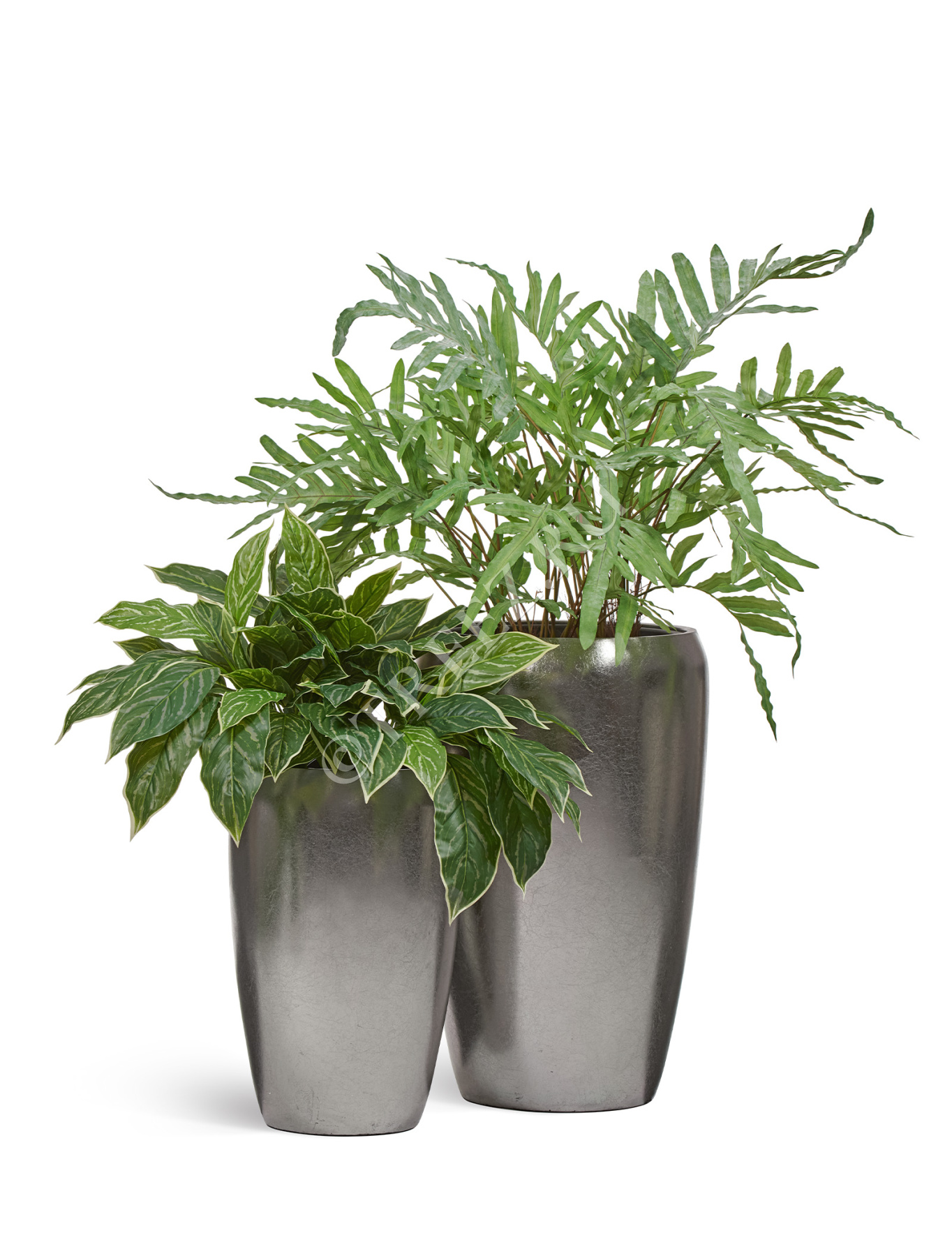 Сет № 125 - Композиция с папоротником и аглаонемой в серебряных кашпо Treez Effectory Metal